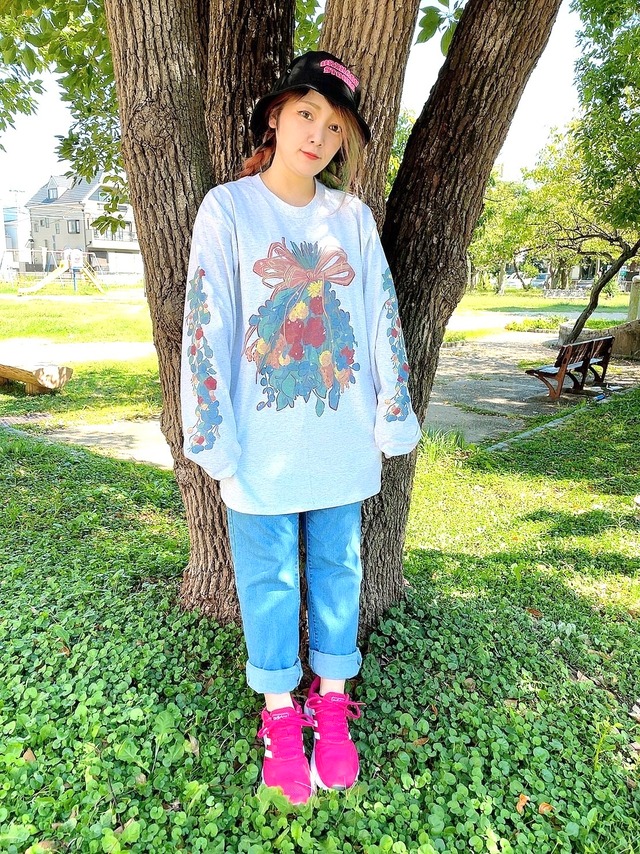 当店のストリートロゴが胸元にあしらわれたロンTです。 袖には避妊具をポップに表現したスケベデザインが入っています。 布地とプリントカラーの組み合わせが各種ございます。 サイズ:Lサイズ