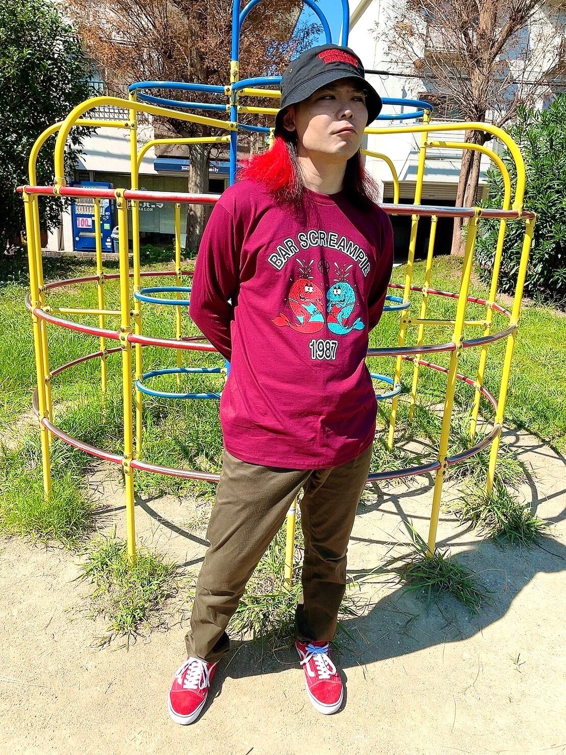 バースクリームパイのオリジナルキャラクター【ホエール・ボーンズ】君の ロンTです。 マルーンとフォレストグリーンの2色展開です! サイズ:L